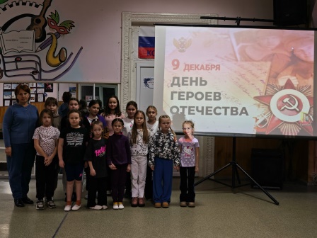 В день Героев Отечества в Доме культуры состоялся урок мужества «Наши земляки-России славные сыны». Участники мероприятия познакомились с историей знаменательного события. Дети узнали о том, что во все времена наш народ защищал свою землю, об известных героях России, о том, какие подвиги они совершили. С помощью мультимедийной презентации библиотекарь рассказала ребятам об учреждении ордена Святого Георгия Победоносца и других наградных знаках и орденах.